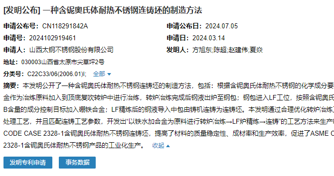 2024年7月5日,山西太鋼不銹鋼股份有限公司成功申請(qǐng)一項(xiàng)名為“一種含鈮奧氏體耐熱不銹鋼連鑄坯的制造方法”專利,申請(qǐng)公布CN118291842A,申請(qǐng)日期為2024年3月14日。
