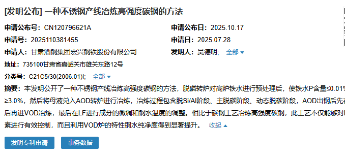 2025年10月17日,甘肅酒鋼集團(tuán)宏興鋼鐵股份有限公司成功申請(qǐng)一項(xiàng)名為“一種不銹鋼產(chǎn)線(xiàn)冶煉高強(qiáng)度碳鋼的方法”專(zhuān)利,申請(qǐng)公布號(hào)為CN120796621A,申請(qǐng)日期為2025年7月28日。